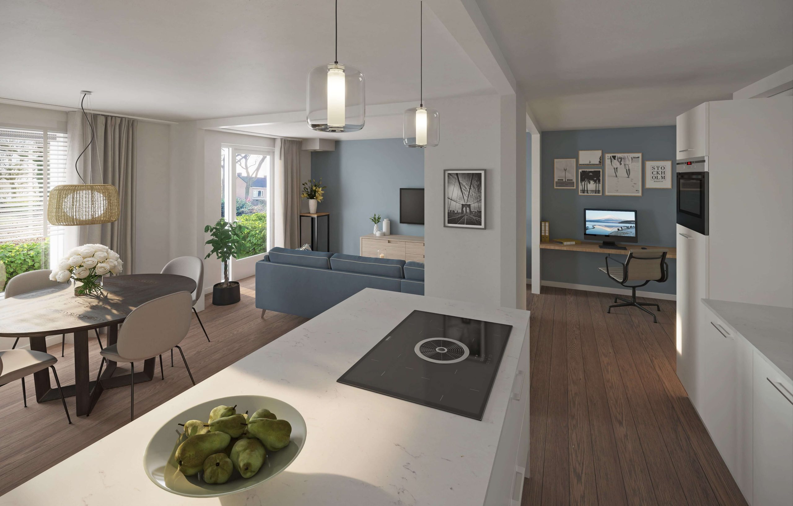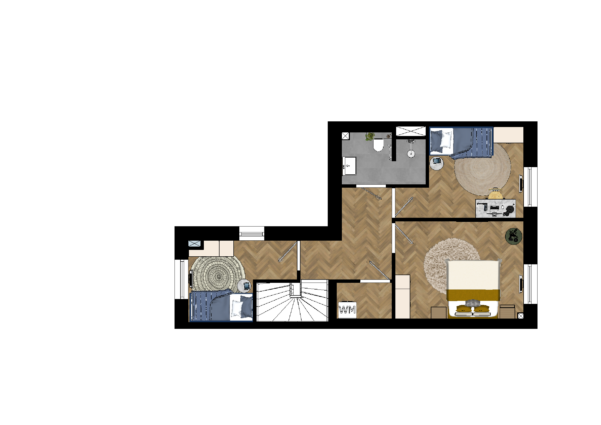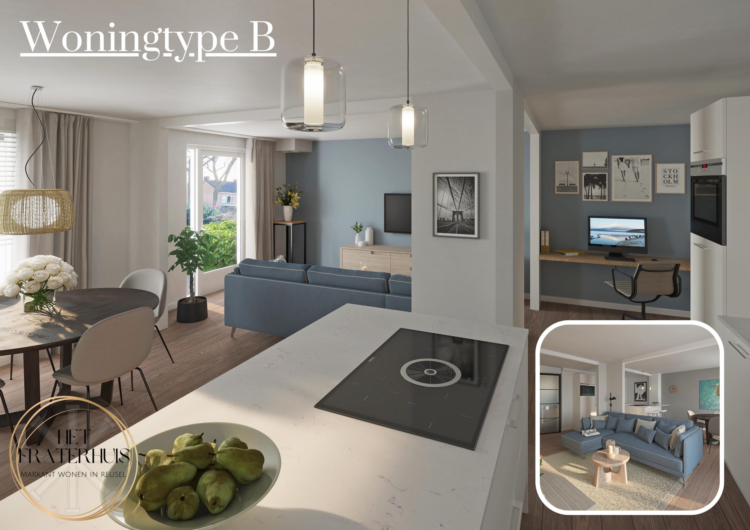 Wonen op een prominente plek in een mooie groene omgeving? Dan kies je voor één van de vijf tussenwoningen in het voormalige Fraterhuis. Modern in een karakteristiek jasje! Woningtype B is vergelijkbaar met woningtype A, maar met ca. 81 m² woonoppervlakte op een perceel van 122 m² net iets kleiner. Toch is er genoeg plek voor een keuken met kook/schiereiland dat uitkijkt over het eigen terras aan de voorzijde. De entreehal bevindt zich aan de achterzijde en is voorzien van het toilet en de trapopgang naar de verdieping. Daar bevinden zich drie slaapkamers, de badkamer en een separate wasruimte. De bergzolder met open technische ruimte is te bereiken middels een vlizotrap.