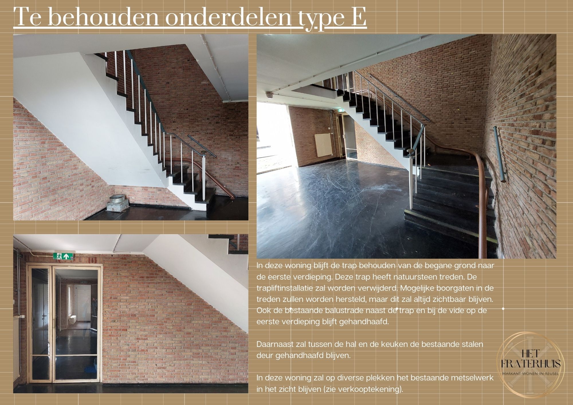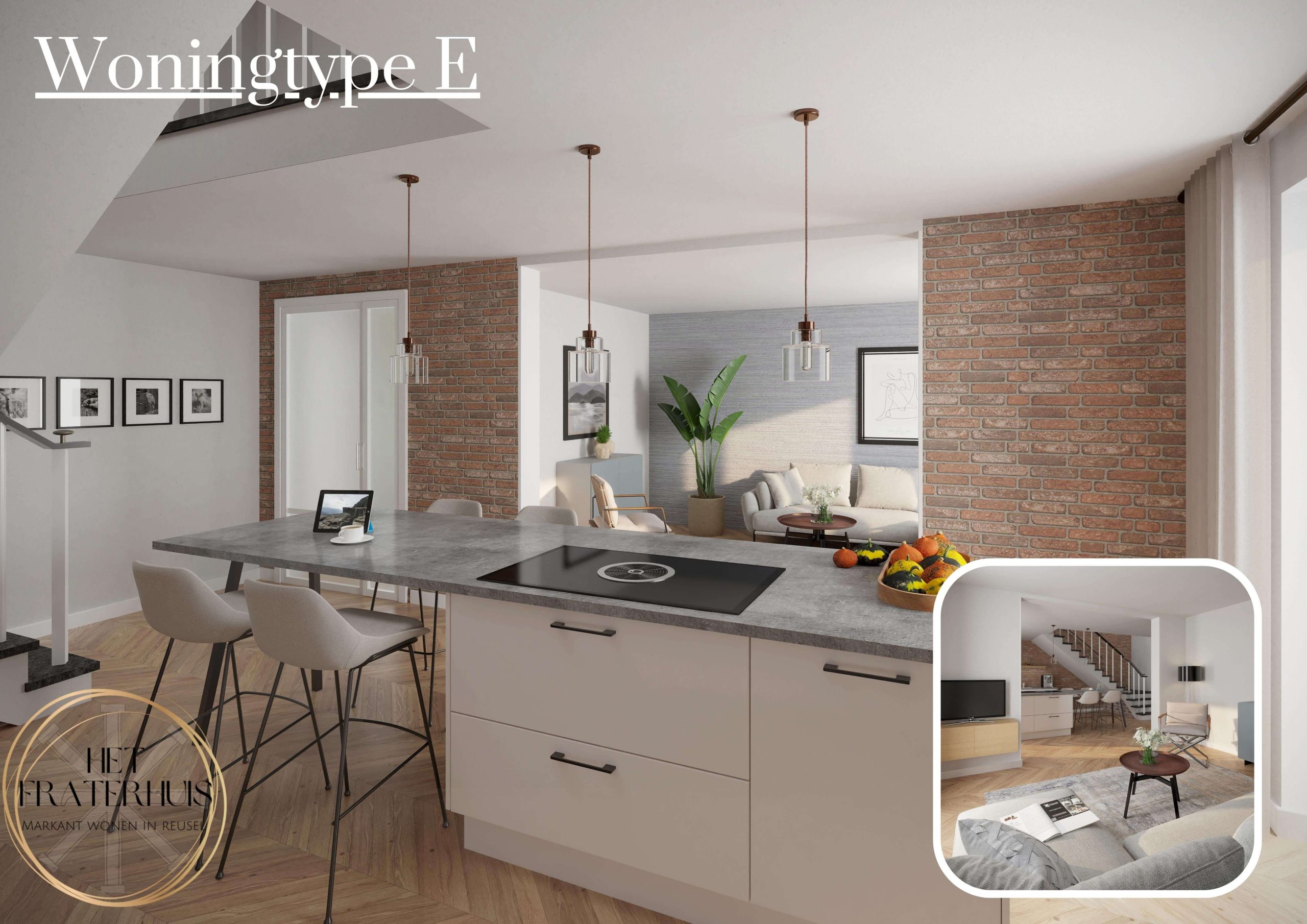 Wonen op een prominente plek in een mooie groene omgeving? Dan kies je voor één van de vijf tussenwoningen in het voormalige Fraterhuis. Modern in een karakteristiek jasje! Een eigentijdse uitstraling met een vleugje karakter! Woningtype E onderscheidt zich echt met de monumentale trap op de begane grond, die doorloopt in een vide op de eerste verdieping. Op verschillende plekken in deze woning blijft het metselwerk zichtbaar en een deur krijgt een tweede leven. Deze woning heeft ca. 76 m² wonen op een perceel van ca. 102 m². Het terras bevindt zich aan de voorzijde met zicht op de Groeneweg. De entreehal ligt aan de achterzijde van het gebouw met toegang tot het toilet. De verdieping met vide en bestaande balustrade kan ingericht worden als werkkamer en biedt ruimte voor je was-apparatuur. Daarnaast heb je hier de beschikking over een slaapkamer met badkamer en-suite. De bergzolder met open technische ruimte is te bereiken middels een vlizotrap.
