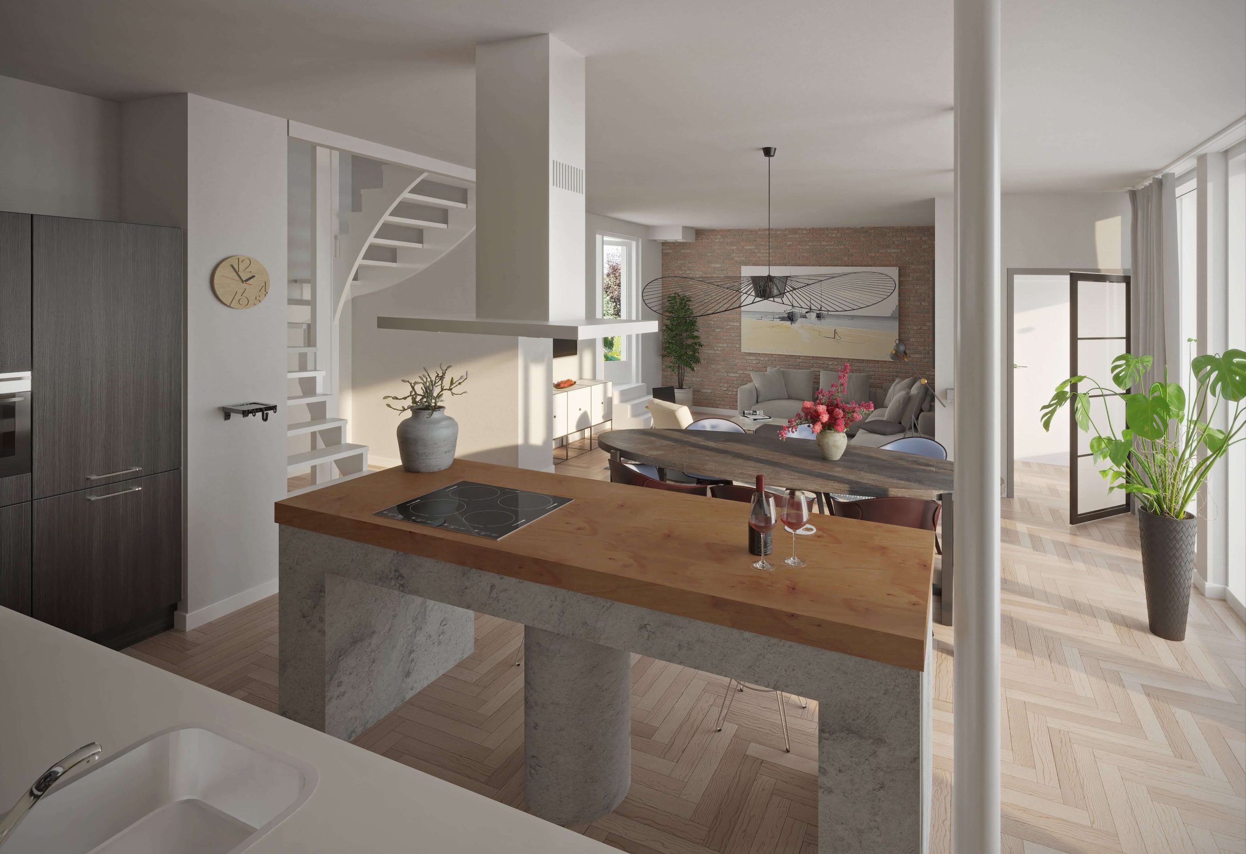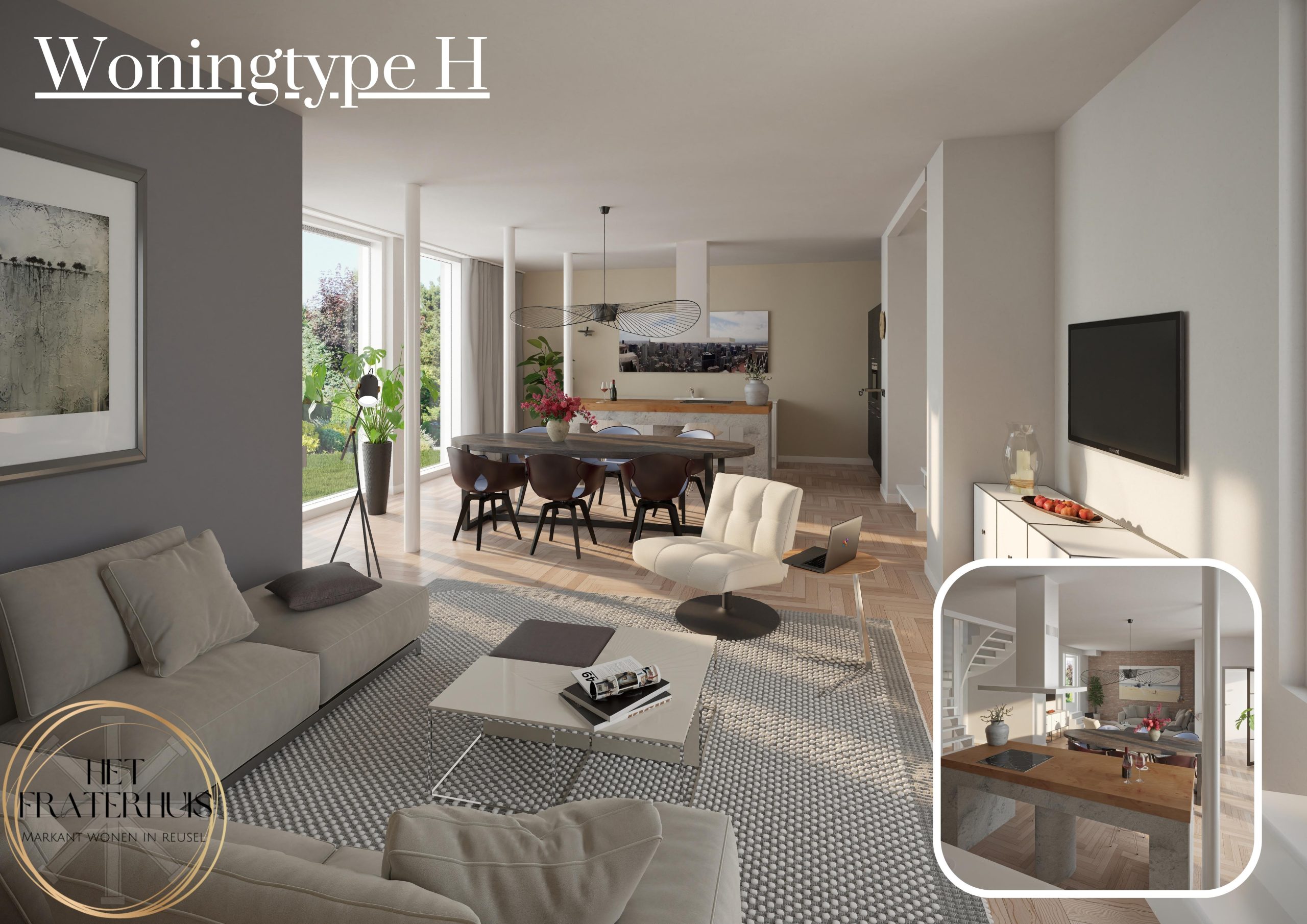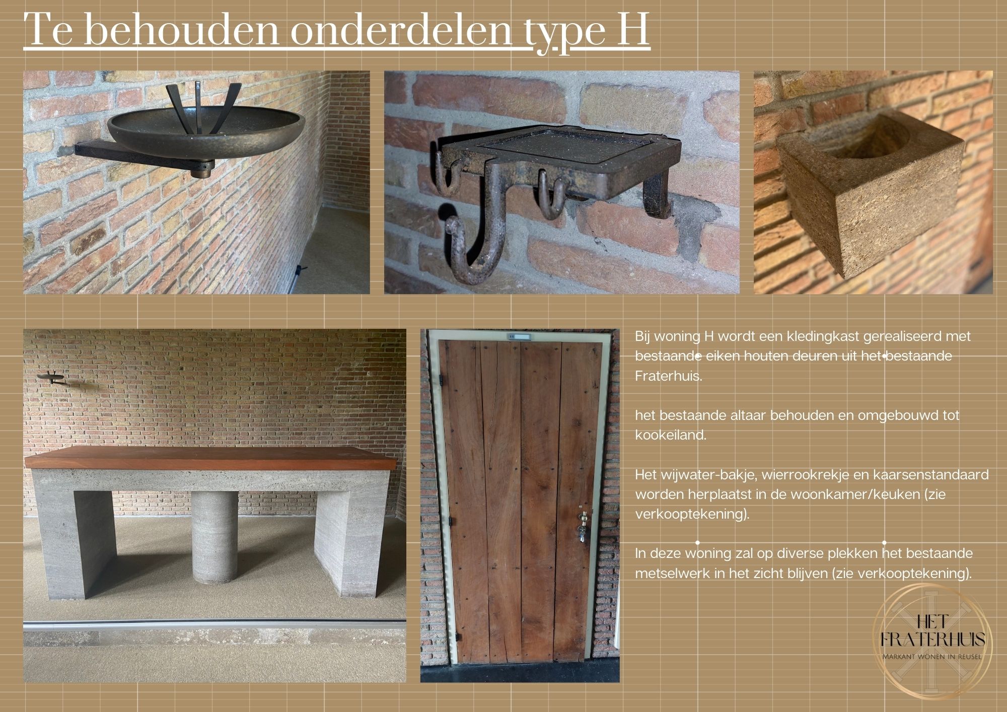 Wonen op een prominente plek in een mooie groene omgeving? Dan kies je voor één van de drie hoekwoningen in het voormalige Fraterhuis. Modern in een karakteristiek jasje! Woningtype H betreft de hoekwoning aan het einde van de rechterzijde. Kies je voor deze woning dan woon je uiteindelijk in de voormalige kapel van het Fraterhuis en wordt het oude altaar jouw nieuwe kookeiland! Woningtype H koestert diverse bewaarde elementen, waaronder de elegante kaarsenhouder, het charmante wierookrekje, het wijwaterbakje en de authentieke deuren worden hergebruikt als kledingkast!